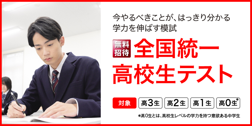 受験する前はそう思うかもしれません。しかし、模試を受験すること自体に意味があります。まずは点数を気にするのではなく、「自分は何ができて、何ができないのか」を把握するため、そしてどのような出題がされるか知ることが大切です。学力を大きく伸ばすきっかけとして、今回の全国統一高校生テストに挑戦してください。